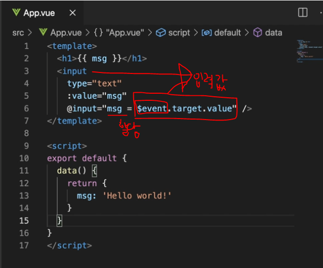 v-model.lazy="msg" 와 @change='msg=$event.target.value' 가 같은것