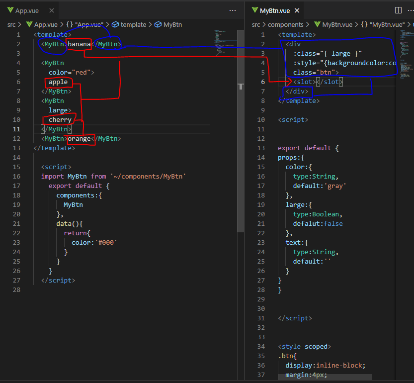 props를 통해 color라고 외부에서 받을수있는 type은 스트링 기본값은 gray인 color을만들어놓는다.class를 props로 생성하여 삽입할때 :class="{ 클래스명 }" <slot></slot>은 text값으로 사용될 수있다.부모 vue에서 class나 style이 자식template에 있는 최상위 태그1개에만 적용되므로 inheritAttre를 false를 통해 상속을 거부하고 필요한 요소만 $attrs를 통해 상속하거나 v-bind="$attrs"로 원하는 태그에 전체 상속을 해줄수있다.
