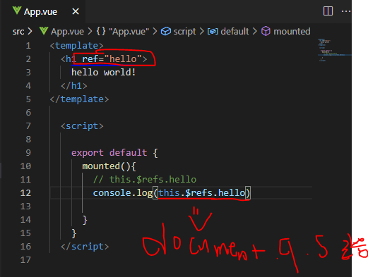 template안에 tag에 ref를 주고 export에서 $refs. ref명 으로 호출하면 document.queryselector처럼 태그의 값만 나오게된다외부 vue의 태그 값을 찾을시 $refs.ref명.$el로 최상위 태그 값을 가져오고 태그값이 여러개일시 외부 vue의 찾을 태그에 ref를 다시주어 검색한다.