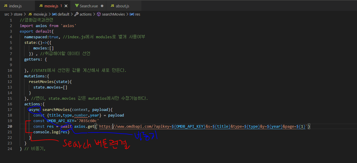 movie.js에 actions비동기를 search.vue에 검색버튼에 연결된 methods에 있던것을 가져와 옮긴다.