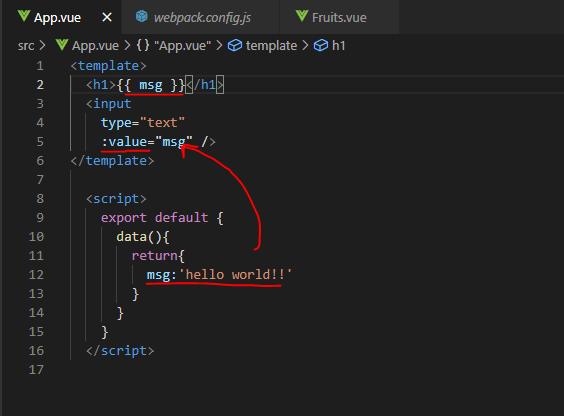 단방향 데이터 바인딩 구조양방향 데이터 바인딩 구조양방향 바인딩 v-model은 input값에 들어온값을 뒤에 변수에 할당시킨다.